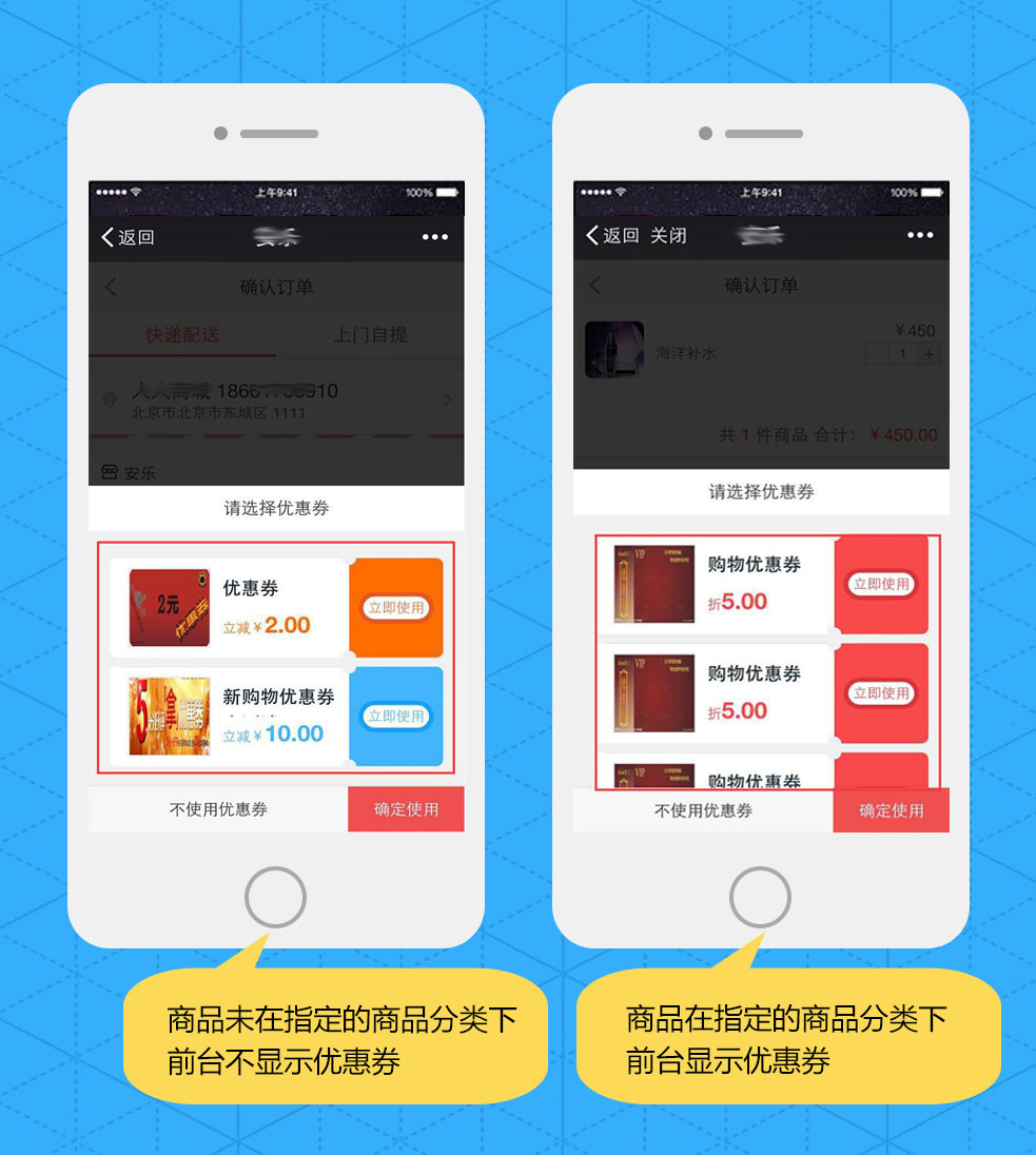 知品微商城优惠券可设置某商品或商品分类等才可使用的权限,具体参见下图: