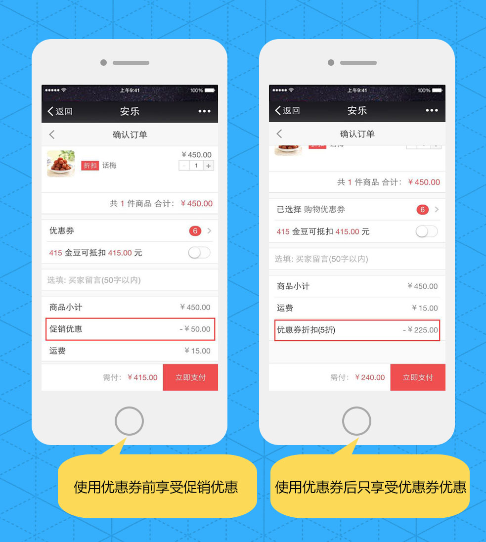 例如:商城某商品有促销营销活动或会员折扣设置,则会员购买商品后,即可使用领取的优惠券,同时也享受促销价或会员折扣价。