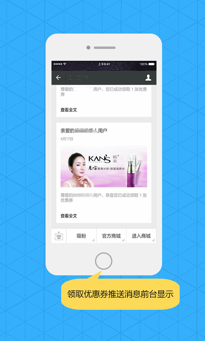 可以选择商城中的商品链接或其它链接,选择后推送的消息通知买家点击查看全文时可直接跳转到选择的链接页面,如果不选择链接则系统默认为优惠券的详情,设置好后买家领取或购买优惠券后,会直接收到消息通知,参见下图: